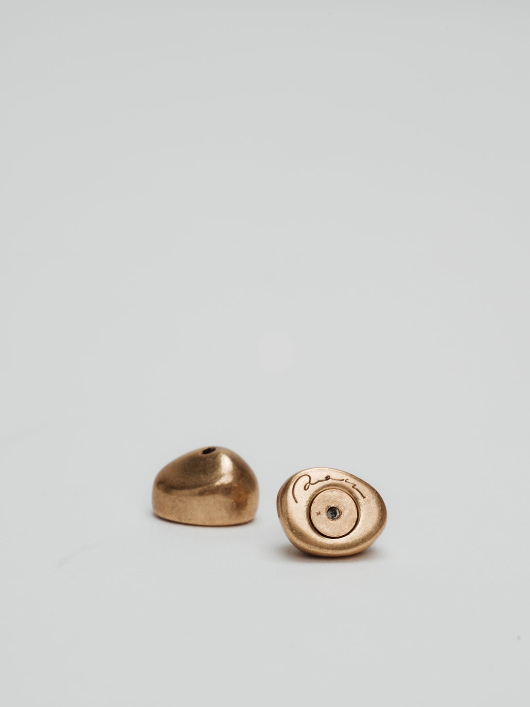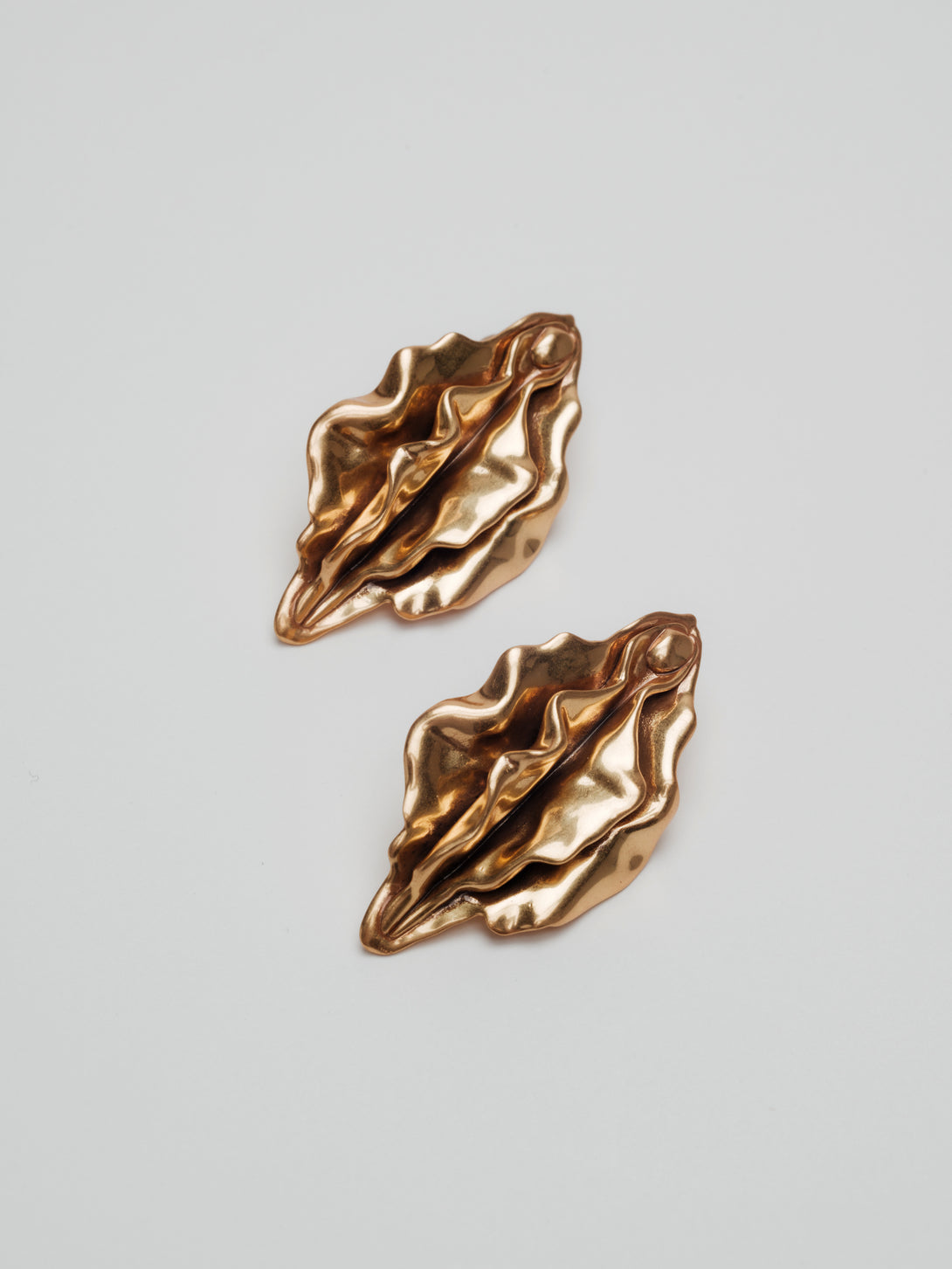 Crafted in antique brass, shapely contours honor the intimate as a new mode of feminine adornment. These statement-making earrings are sold as a pair.